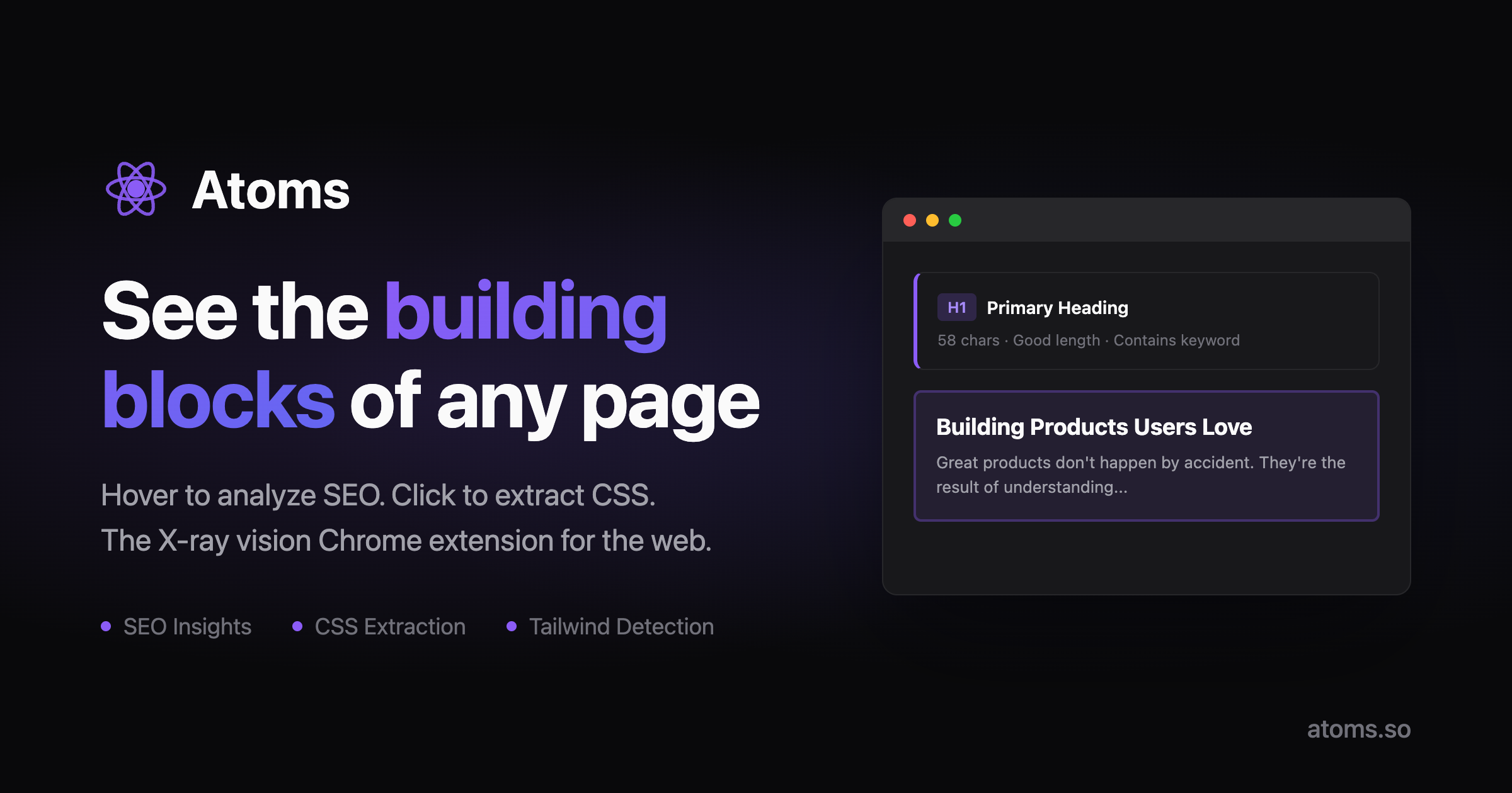 Atoms is a Chrome extension that allows users to inspect the building blocks of any website. It provides X-ray vision for the web, allowing developers to view SEO elements (like H1 structure and content hierarchy) and CSS styles (including Tailwind classes and pseudo-elements) with a simple hover or click.