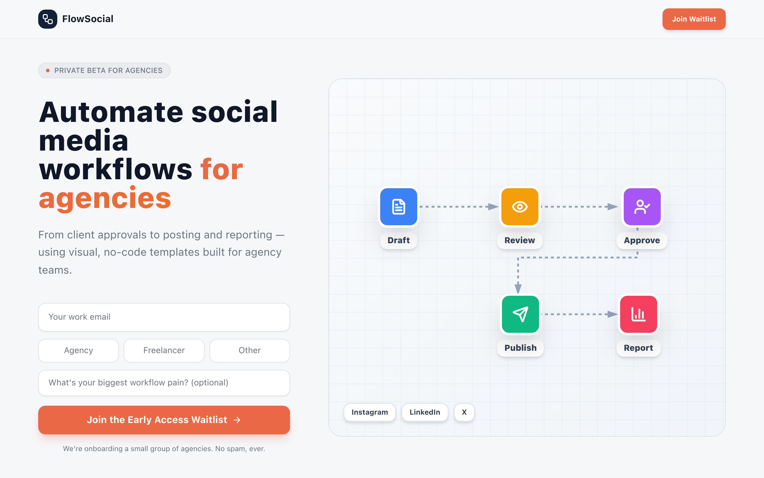 FlowSocial is a visual automation tool designed specifically for social media agencies. It aims to streamline workflows by providing features for approvals, posting, and reporting, all within a visual interface.