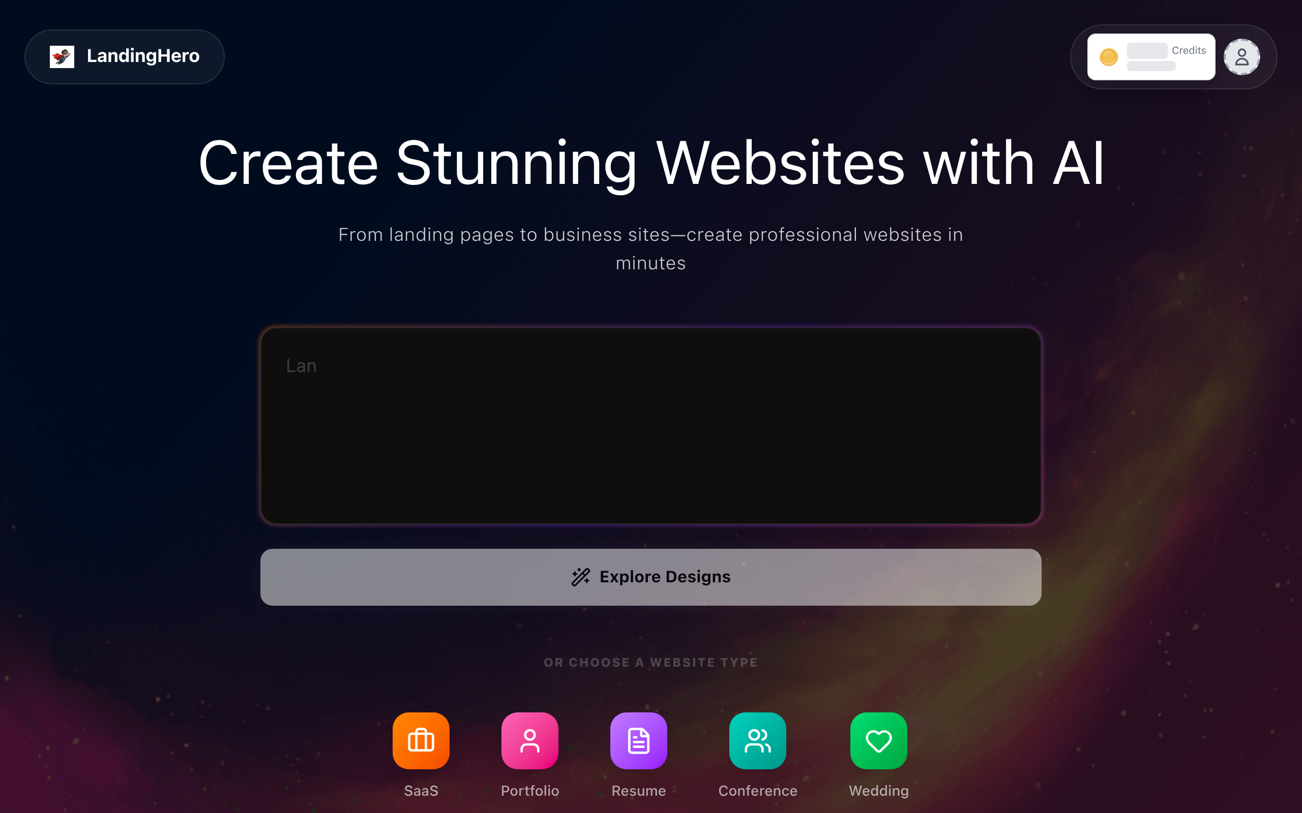 LandingHero uses AI to generate stunning websites, from simple landing pages to full business sites. You can explore AI-generated designs or select a specific website type, such as SaaS, Portfolio, or Resume, and have a tailored website created quickly.