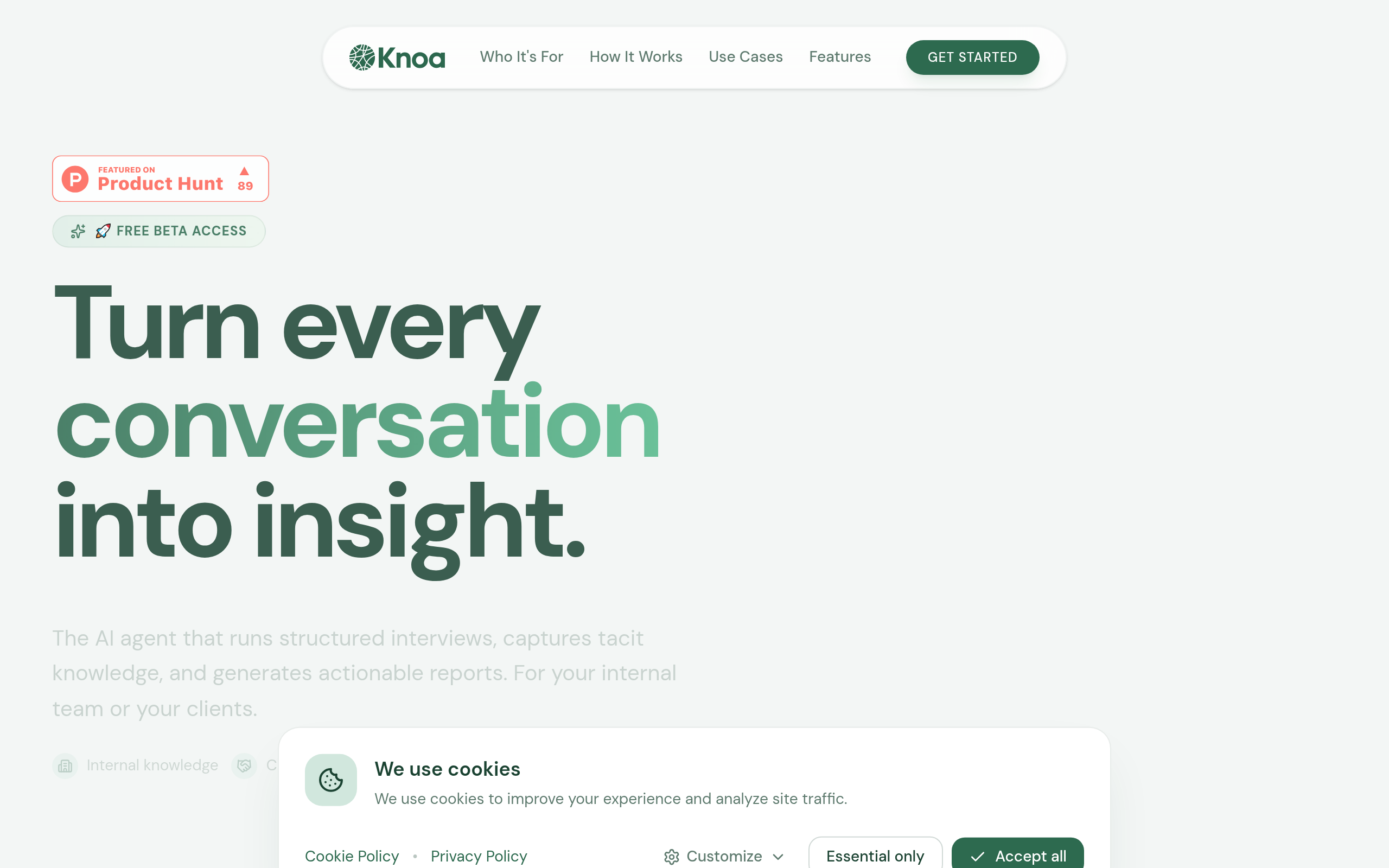 Knoa AI is an intelligent knowledge base platform that uses artificial intelligence to automatically capture, organize, and make searchable a team's collective knowledge. It integrates with various team communication tools and documents to consolidate information, allowing users to quickly find answers through natural language queries.