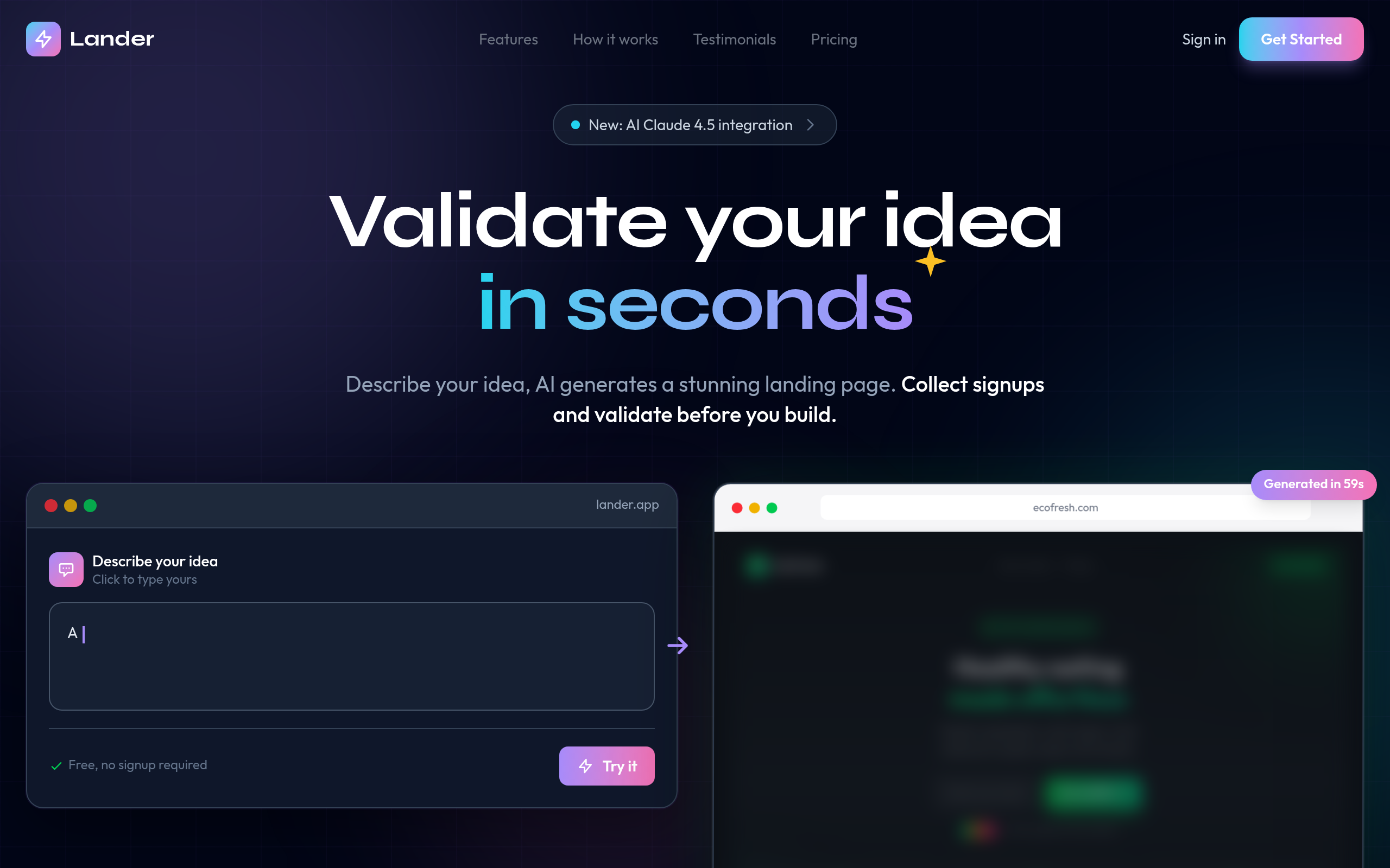 Lander is an AI-powered tool designed to combat the 'Over-Engineering' trap by enabling users to generate a high-converting SaaS landing page in under 60 seconds. The goal is to provide a quick validation page for new ideas, allowing founders to test Product-Market Fit (PMF) before investing significant time in backend development. It aims to offer speed over intricate design, providing immediate feedback from potential users.