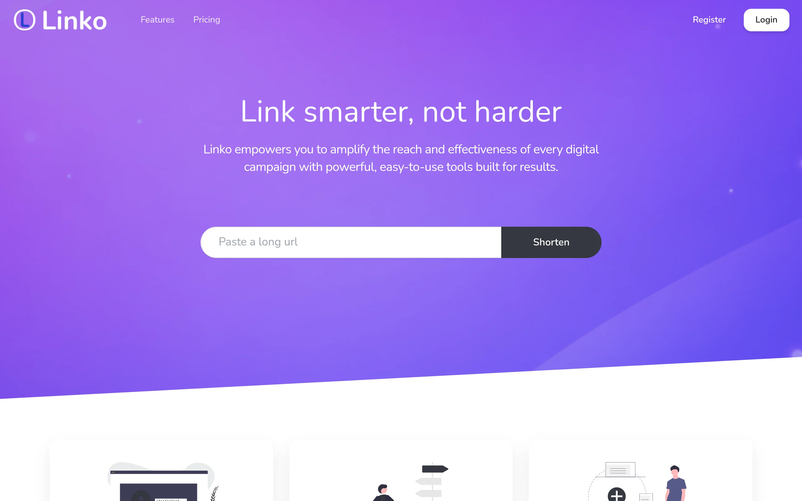 Linko is a professional URL shortener and link management platform. It allows you to create custom short links to enhance your marketing efforts. It seems like you would need Javascript enabled to use it.