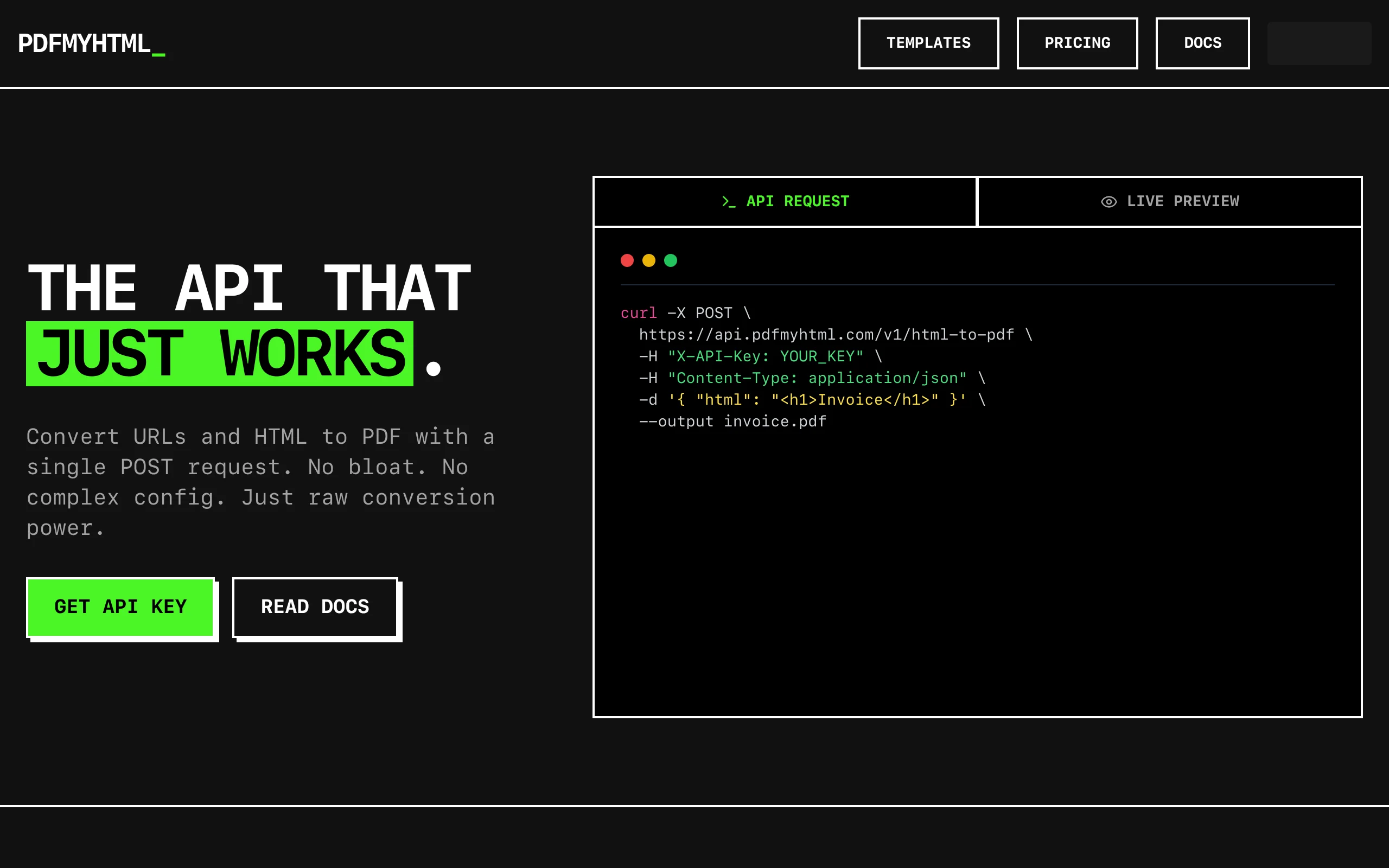 pdfmyhtml is an API that converts HTML and URLs to PDF using a simple POST request. It's built for speed and accuracy, with a single endpoint that accepts JSON or raw HTML. You can also manage Handlebars/Jinja2 templates directly in your dashboard.