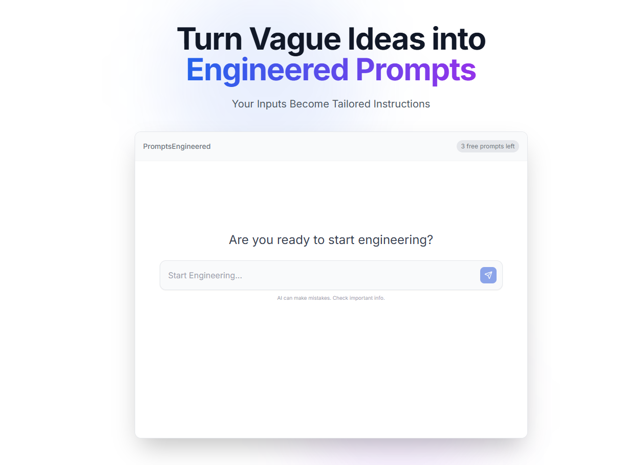 PromptsEngineered helps users overcome the challenge of generating effective AI results by transforming their ideas into ready-to-use prompts. Users simply describe their needs, answer a few guided questions, and receive optimized prompts to bridge the gap between their concepts and AI output.