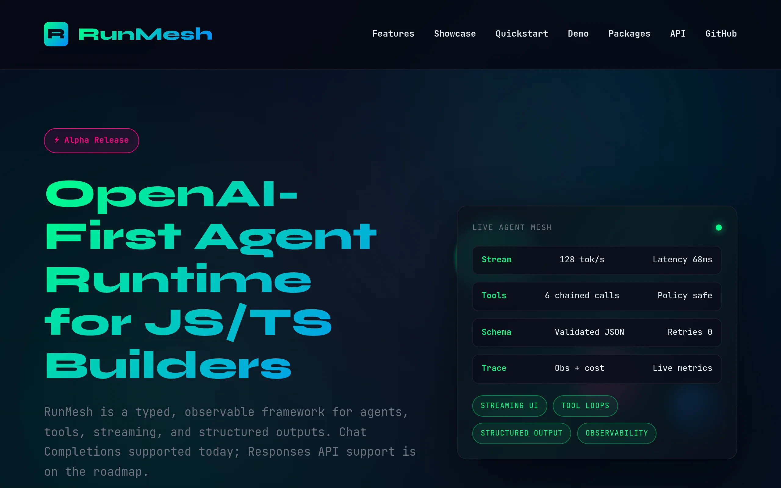 RunMesh is a typed, observable framework designed for building agentic applications using JavaScript and TypeScript. It provides tools for agents, streaming, structured outputs, memory, and observability, enabling developers to create complex, multi-round agent workflows. With RunMesh, you can define tools with Zod schemas, validate inputs, and achieve reliable structured data extraction.