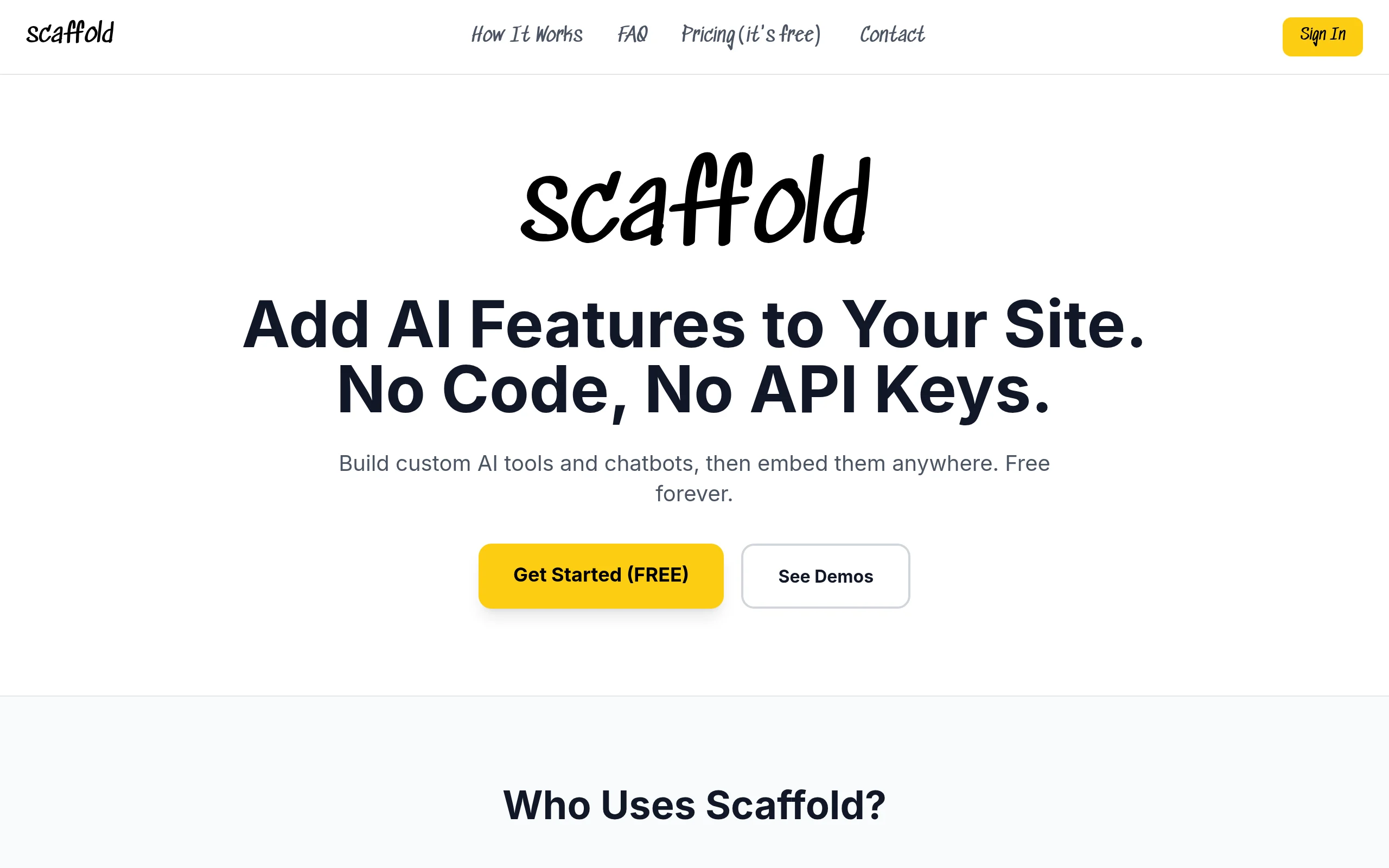 Scaffold lets you build custom AI tools and chatbots and embed them anywhere on your site. It's free forever and requires no code or API keys. It's perfect for hobbyists, indie devs, and small businesses looking to prototype AI features or add AI tools to their site without hiring developers.