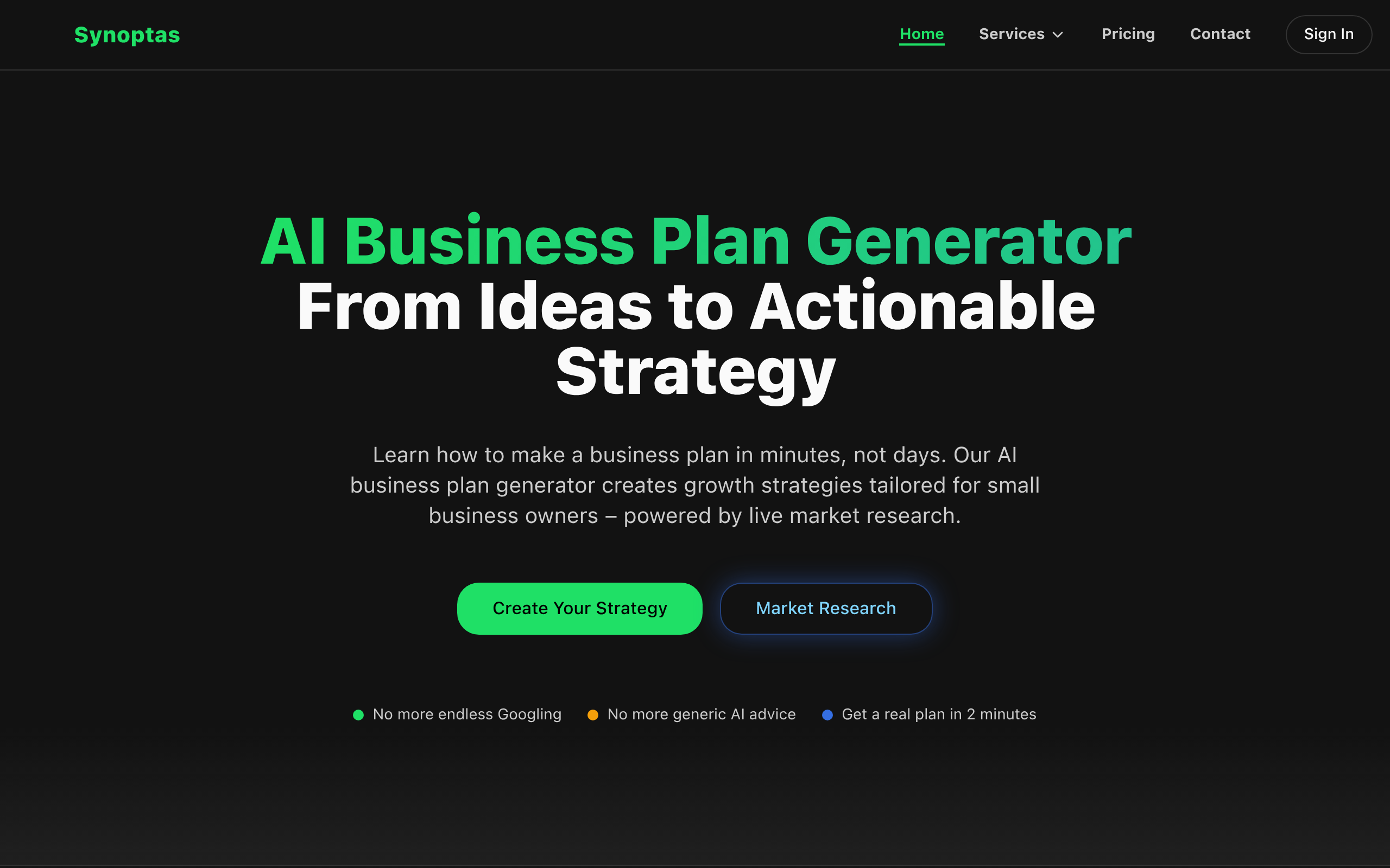 Synoptas analyzes a provided website URL to identify improvement strategies. It also offers business market analysis to help users create targeted growth plans. The platform aims to provide actionable insights for business development.