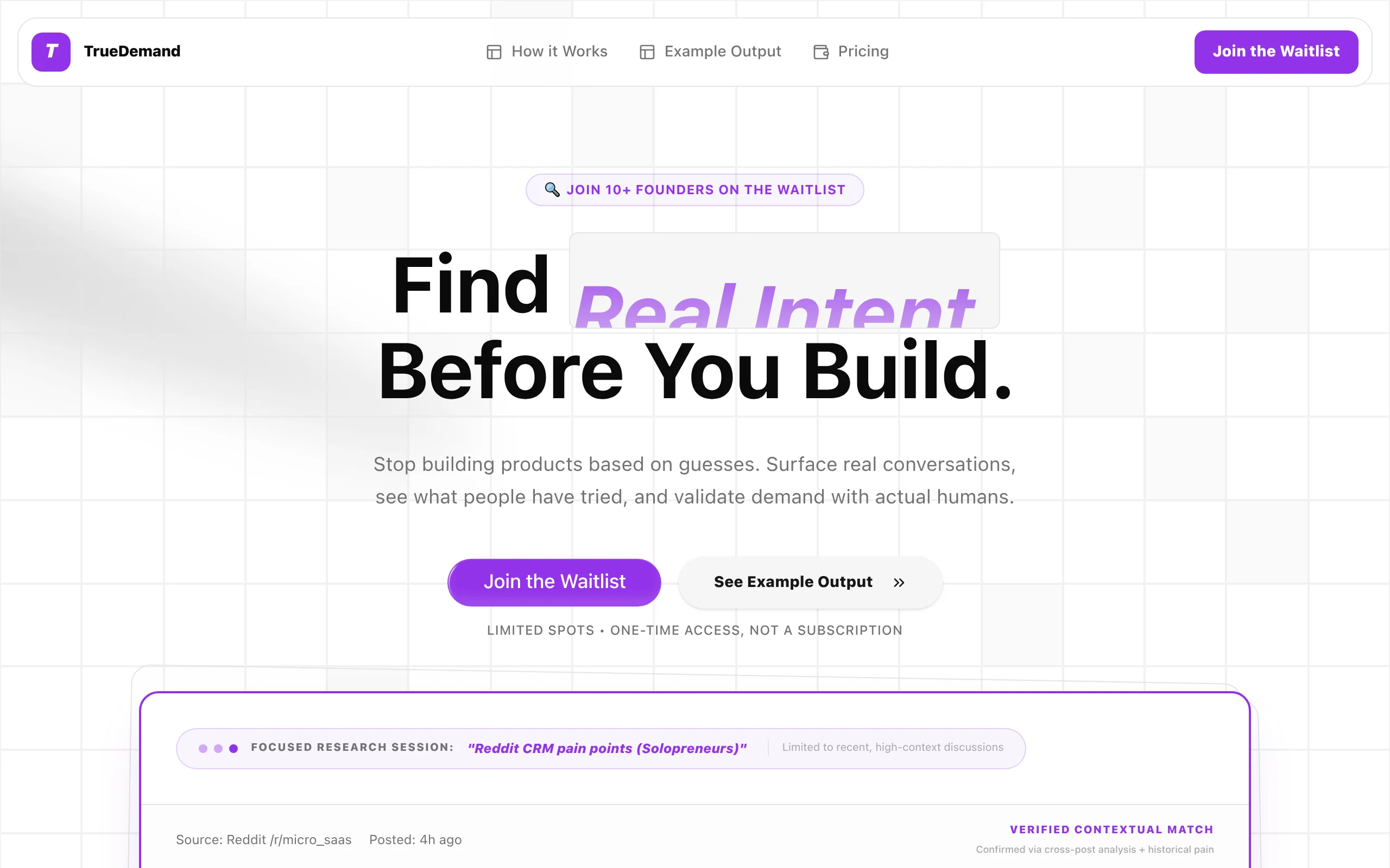 TrueDemand helps founders validate ideas by surfacing real people already struggling with a problem. It scans public conversations on platforms like Reddit and X, filtering for high-intent language. It provides context-rich user insights and verified platform data, helping to understand user pain points and identify potential customers.