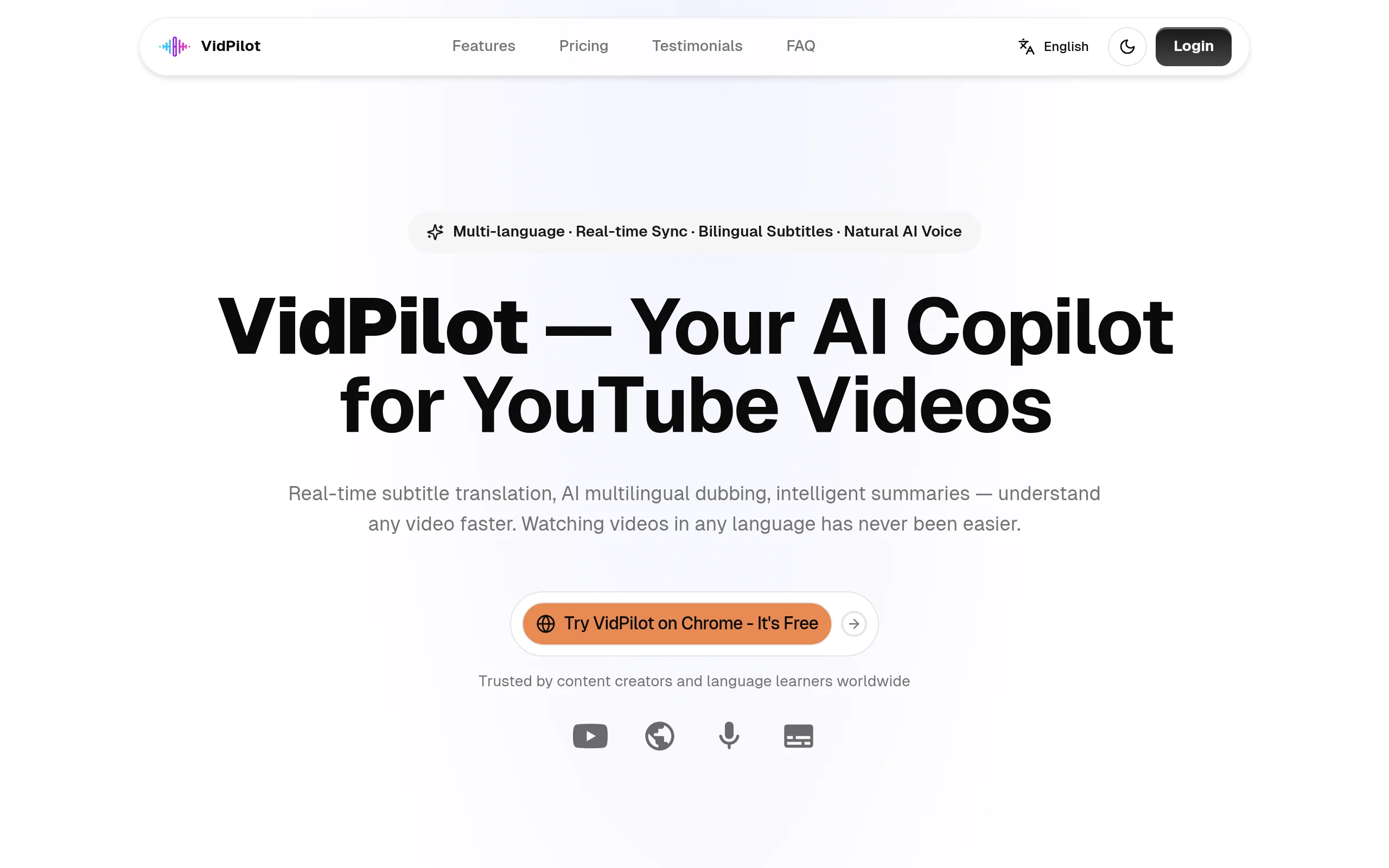VidPilot is an AI copilot for YouTube videos, offering real-time subtitle translation and multilingual dubbing. It provides intelligent summaries and Q&A, allowing users to quickly understand and extract key information from videos. It caters to content creators, language learners, and anyone looking to comprehend video content efficiently.