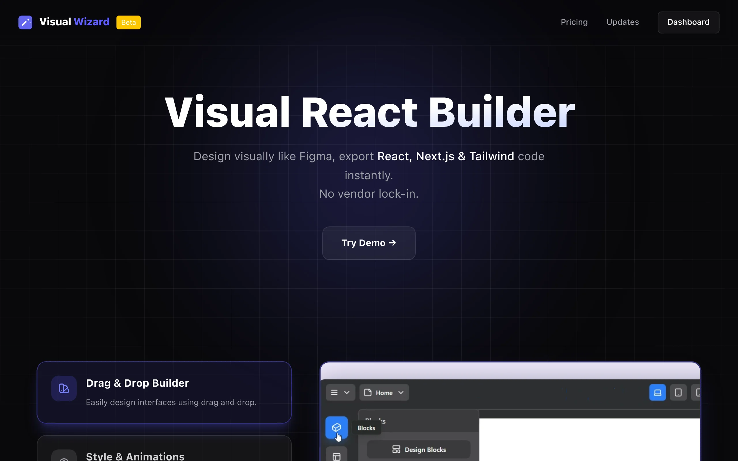 Visual Wizard is a visual React builder that allows you to design interfaces using drag and drop. You can style elements, add animations, and export your design into React, Next.js, and Tailwind code with a single click. It offers a component system with reusable components and a style token system for consistent designs.